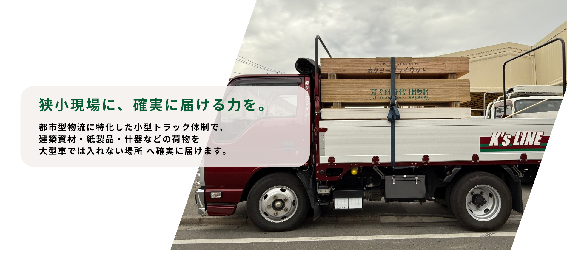 ケーズラインでは、狭小現場への搬入や都心部の複雑な導線といった、都市型物流ならではの課題に最適化したサービスを提供しています。